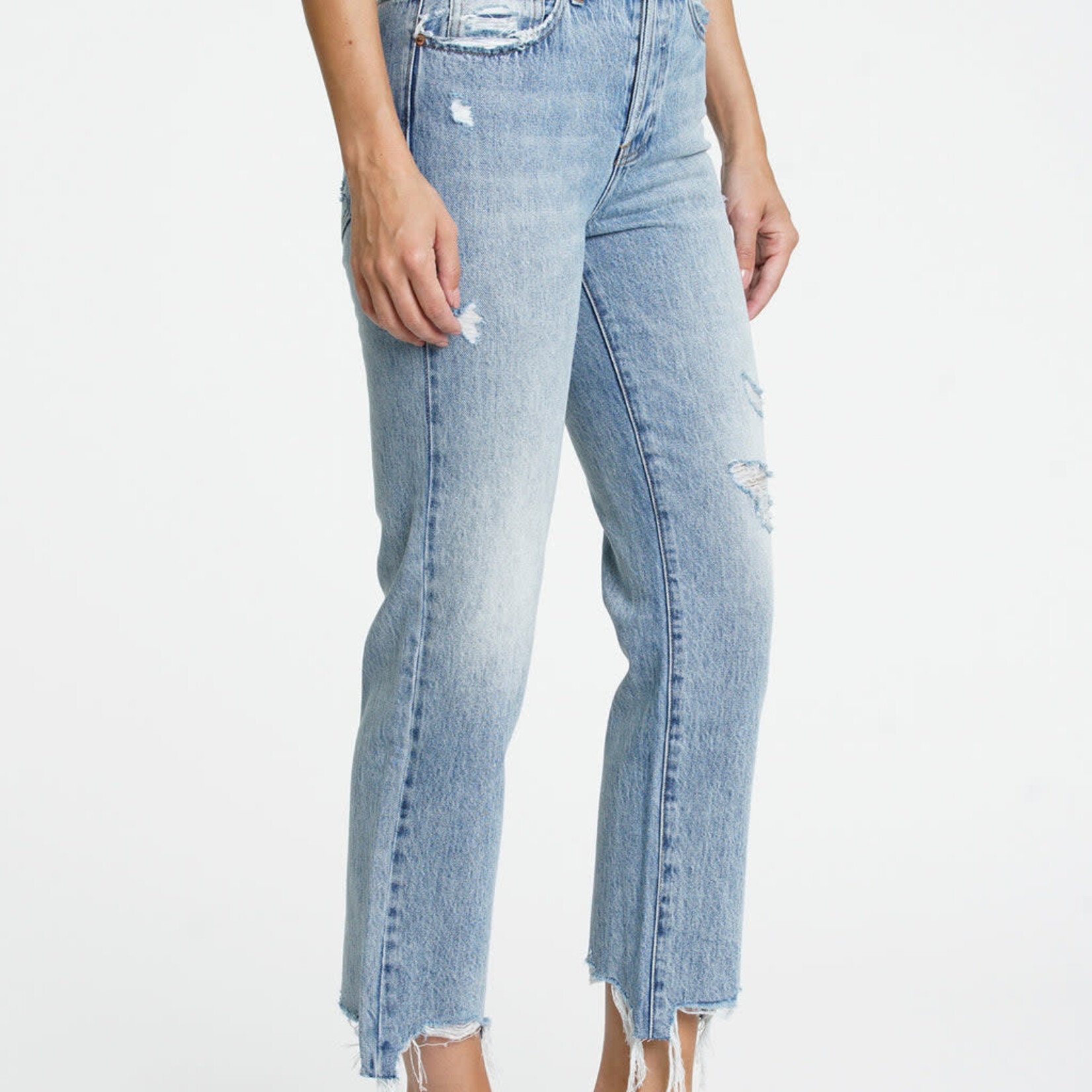 The Charlie is a high rise straight leg. This style in the Ruthless wash features a destructed hem with fray.
